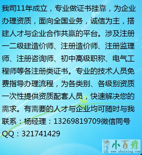 •xbaixing.com年底最后一波招聘:已签约的现成企业,收到材料立即办理不拖延,注册成功快拿钱快!仅资质用不承担任何责任无风险并承诺后期一切转出手续,早办理早拿钱,有意者随时联系:小 百 姓 网杨工:132,6981,9709www.xbaixing.com小百姓网(V信同号)www.xbaixing.com小百姓网QQ:3217,41429小.百.姓.网